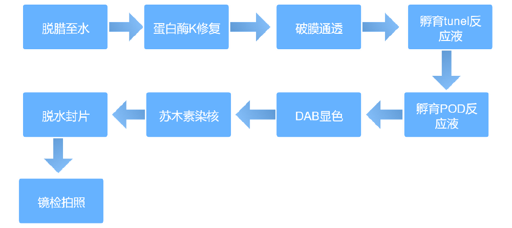 晚期凋亡細(xì)胞中染色體DNA雙鏈或單鏈斷裂產(chǎn)生粘性3'-OH末端,在脫氧核糖核苷酸末端轉(zhuǎn)移酶(TdT)的催化下,將帶有生物素(Biotin)分子的dUTP,標(biāo)記到DNA的3'-末端,隨后和辣根過氧化物酶(HRP)標(biāo)記的鏈酶親和素Streptavidin(Streptavidin-HRP)結(jié)合,最后通過DAB顯色來顯示凋亡細(xì)胞,從而可以通過普通光學(xué)顯微鏡檢測到凋亡的細(xì)胞,這就是Tunel(TdT-mediateddUTPNick-EndLabeling)法檢測細(xì)胞凋亡的原理。