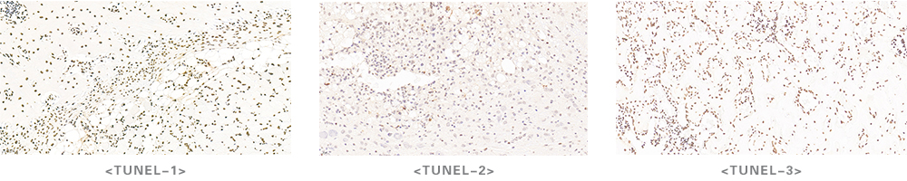 Tunel染色即原位末端轉(zhuǎn)移酶標(biāo)記技術(shù)。凋亡細(xì)胞的DNA雙鏈斷裂或一條鏈出現(xiàn)缺口,產(chǎn)生一系列3’-OH末端,在脫氧核糖核苷酸末端轉(zhuǎn)移酶(TdT)作用下,將脫氧核糖核苷酸和生物素所形成的衍生物標(biāo)記到DNA的3′末端,從而進(jìn)行凋亡細(xì)胞的檢測。TUNLE染色是分子生物學(xué)與形態(tài)學(xué)相結(jié)合的研究方法,對完整的單個凋亡細(xì)胞核或凋亡小體進(jìn)行原位染色,能準(zhǔn)確的反應(yīng)細(xì)胞凋亡最典型的生物化學(xué)和形態(tài)特征。